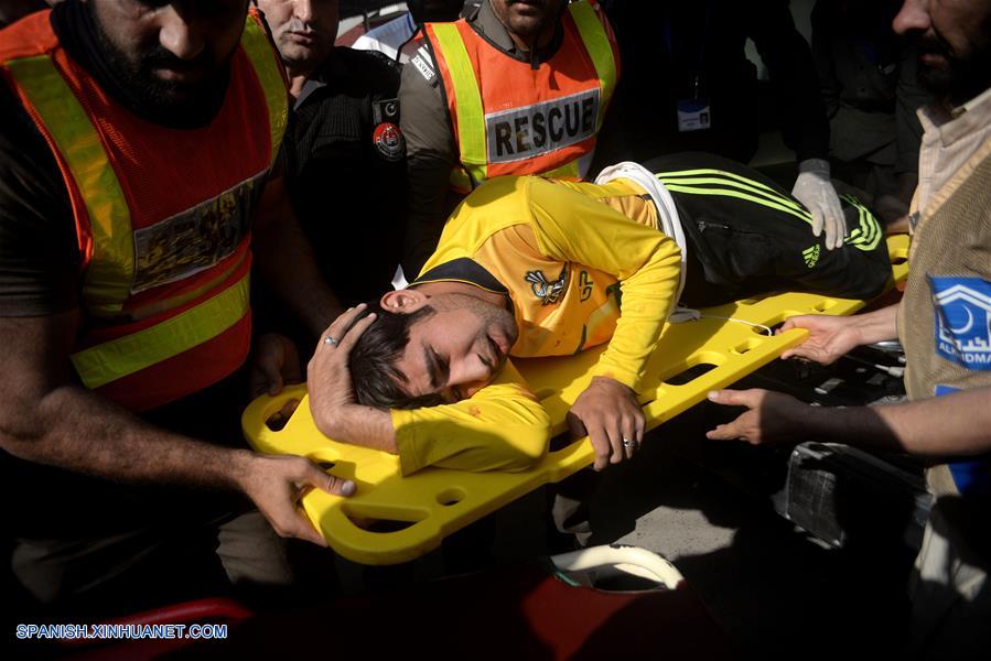 Personas trasladan a un hombre herido a un hospital en Peshawar, Pakistán, el 1 de diciembre de 2017. Al menos nueve personas murieron y 35 resultaron heridas la ma?ana del viernes cuando cuatro terroristas asaltaron un albergue estudiantil ubicado en la ciudad pakistaní de Peshawar, informó el medio local en idioma urdu, ARY. (Xinhua/Umar Qayyum)
