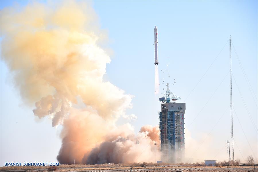 GANSU, diciembre 3, 2017 (Xinhua) -- China lanza un satélite de exploración terrestre a una órbita preestablecida desde el Centro de Lanzamiento de Satélites de Jiuquan, en el desiderto de Gobi en la provincia de Gansu, en el noroeste de China, el 3 de diciembre de 2017. El satélite, lanzado a bordo de un cohete Gran Marcha-2D, será utilizado principalmente para la exploración de detección remota de recursos terrestres. (Xinhua/Zhen Zhe)