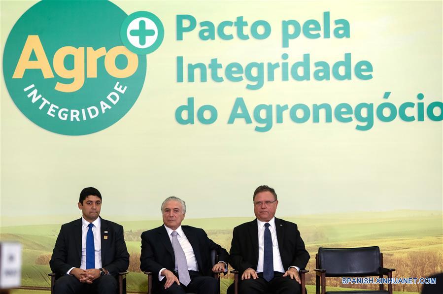 Imagen cedida por la Presidencia de Brasil, del presidente brasile?o, Michel Temer (c), acompa?ado por el ministro de Agricultura de Brasil, Blairo Maggi (d), participando durante un acto de la Confederación Nacional de Agricultura (CNA), en el Palacio de Planalto en Brasilia, Brasil, el 12 de diciembre de 2017. El presidente de Brasil, Michel Temer, afirmó el martes que el país vive un "momento reformista", citando la reforma de la Seguridad Social y la necesidad de aprobarla cuanto antes. La declaración fue realizada en un acto en la Confederación Nacional de Agricultura (CNA), la entidad que reúne a los grandes productores rurales del país. (Xinhua/Alan Santos/Presidencia de Brasil)