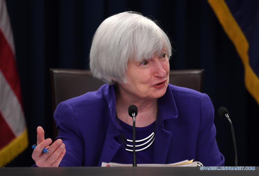 La presidenta de la Reserva Federal (Fed) de Estados Unidos, Janet Yellen, participa en una conferencia de prensa en Washington D.C., Estados Unidos, el 13 de diciembre de 2017. La Reserva Federal de Estados Unidos (Fed) elevó el miércoles las tasas de interés de referencia en 25 puntos base, el tercer incremento de 2017. (Xinhua/Yin Bogu)