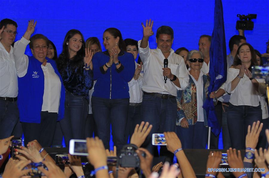 TEGUCIGALPA, diciembre 17, 2017 (Xinhua) -- Imagen del 26 de noviembre de 2017 del presidente de Honduras, Juan Orlando Hernández (3-d), pronunciando un discurso durante un evento luego de conocer los resultados preliminares de las elecciones presidenciales, en Tegucigalpa, Honduras. El Tribunal Supremo Electoral de Honduras (TSE), declaró el domingo ganador de las elecciones del 26 de noviembre al presidente Juan Orlando Hernández, quien se reelige en un segundo período al vencer a Salvador Nasralla de la Alianza de Oposición. Hernández quien corría por el gobernante Partido Nacional (PN), obtuvo 42,95 por ciento frente a 41,42 por ciento de Salvador Nasralla, dijo el presidente del TSE, David Matamoros, en un mensaje a la nación. (Xinhua/Rafael Ochoa)