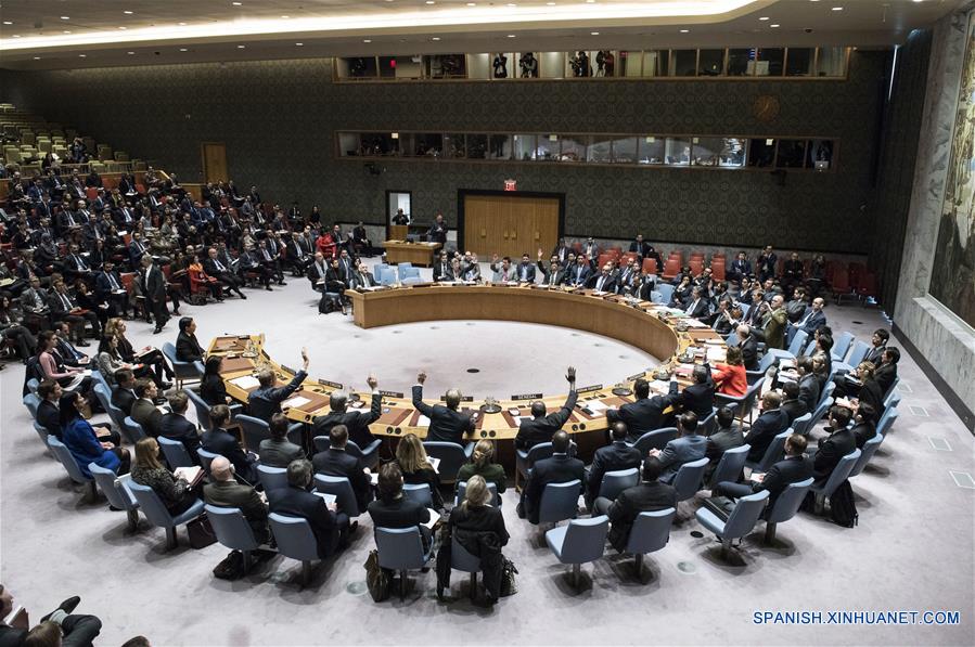 Delegados votan sobre un proyecto de resolución del Consejo de Seguridad de la Organización de las Naciones Unidas (ONU) sobre el estatus de Jerusalén, en la sede de la ONU en Nueva York, Estados Unidos, el 18 de diciembre de 2017. Estados Unidos vetó el lunes un proyecto de resolución del Consejo de Seguridad de la ONU sobre el estatus de Jerusalén. A pesar del hecho de que los otros 14 miembros del Consejo de Seguridad votaron a favor del texto elaborado por Egipto, el proyecto de resolución fue rechazado por Estados Unidos, miembro permanente del Consejo de Seguridad con poder de veto. (Xinhua/UN Photo)