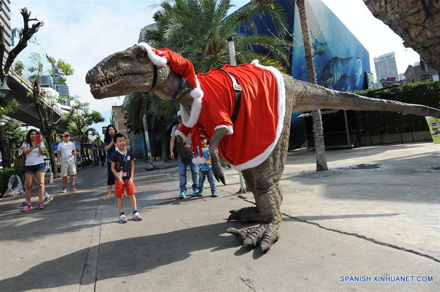 Un empleado de un parque temático vestido como un dinosaurio de Navidad interactúa con visitantes, en Bangkok, Tailandia, el 25 de diciembre de 2017. (Xinhua/Rachen Sageamsak)