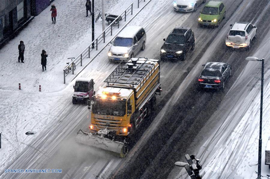 HENAN, enero 4, 2018 (Xinhua) -- Vehículos circulan en la autopista Wei'er cubierta por nieve, en Zhengzhou, capital de la provincia de Henan, en el centro de China, el 4 de enero de 2018. Muchos lugares alrededor de China vieron una nevada el miércoles. (Xinhua/Zhu Xiangi)