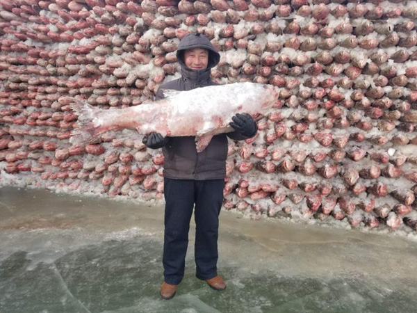 Un pescador muestra un gran pez junto al muro de peces. [Foto proporcionada a chinadaily.com.cn]