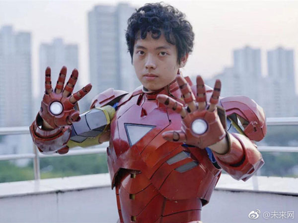Yan Shaoting posa con la armadura que él mismo ha dise?ado y producido. [Foto: Sina Weibo]
