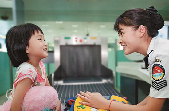 Wu Na conversa con una ni?a en la estación de seguridad del Aeropuerto Internacional de Shanghai Hongqiao.