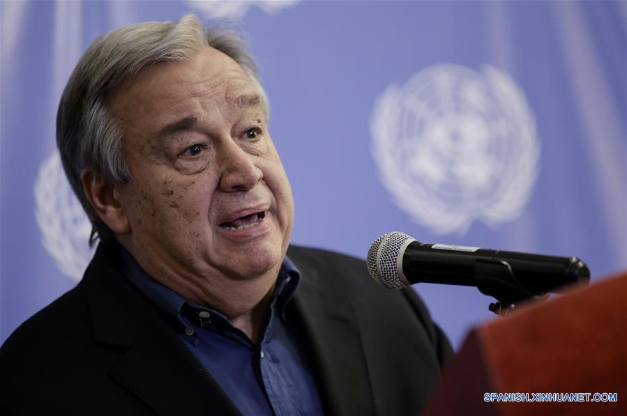 BOGOTA, enero 14, 2018 (Xinhua) -- El secretario general de la Organización de las Naciones Unidas (ONU), António Guterres, participa en una conferencia de prensa durante su visita de dos dias, en Bogotá, Colombia, el 14 de enero de 2018. De acuerdo con información de la prensa local, el secretario general de la ONU, António Guterres visitó la Zona Territorial de Capacitación y Reincorporación de Buenavista, para verificar los avances de la implementación del acuerdo entre el Gobierno y las Fuerzas Armadas Revolucionarias de Colombia (FARC). (Xinhua/Jhon Paz)