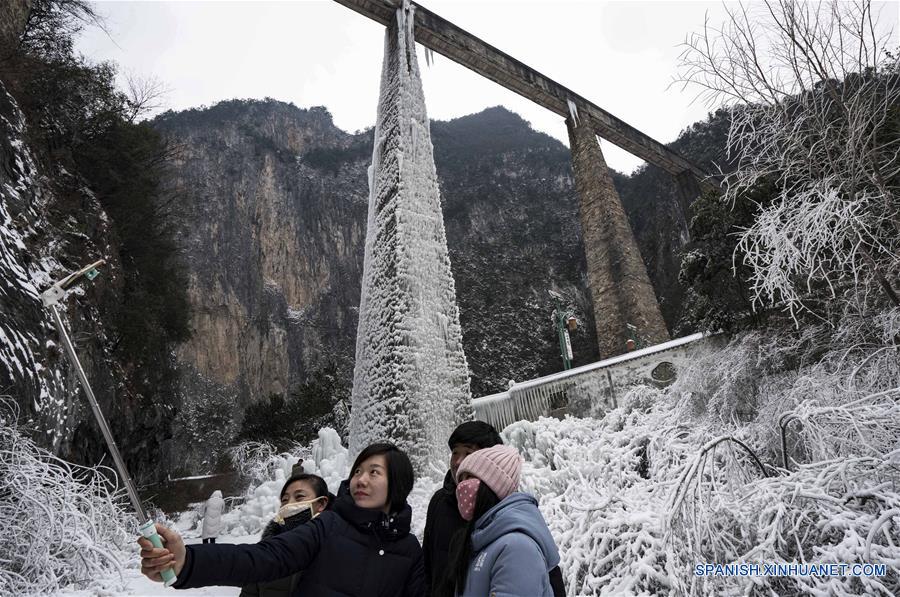 Viajeros se toman una "selfie" frente a los carámbanos sobre las plantas a lo largo de la Autopista Nacional 209 en la villa de Qiaoshang del condado de Fangxian, provincia de Hubei, en el centro de China, el 27 de enero de 2018. (Xinhua/Du Huaju)