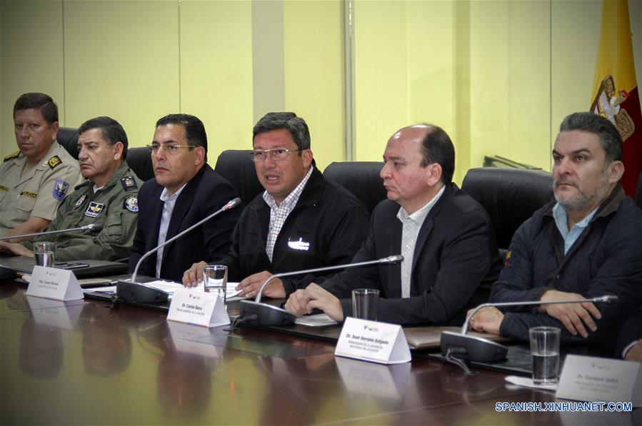 QUITO, enero 27, 2018 (Xinhua) -- El ministro del Interior ecuatoriano, César Navas (c), participa durante una conferencia de prensa en las instalaciones del Ecu 911, en Quito, capital de Ecuador, el 27 de enero de 2017. El presidente de Ecuador, Lenín Moreno, decretó el sábado el estado de excepción en los cantones San Lorenzo y Eloy Alfaro, provincia de Esmeraldas (norte), fronteriza con Colombia, tras el atentado perpetrado contra un comando policial que dejó 23 heridos. Tras solidarizarse con los heridos, Moreno informó que ordenó el reforzamiento de personal policial y militar y la presencia del ministro del Interior, César Navas, en la zona. Navas informó este sábado que la detonación ocurrida la madrugada de este sábado en la parte posterior del comando policial de San Lorenzo afectó al 95 por ciento del edificio, sin dejar víctimas mortales. (Xinhua/Santiago Armas)