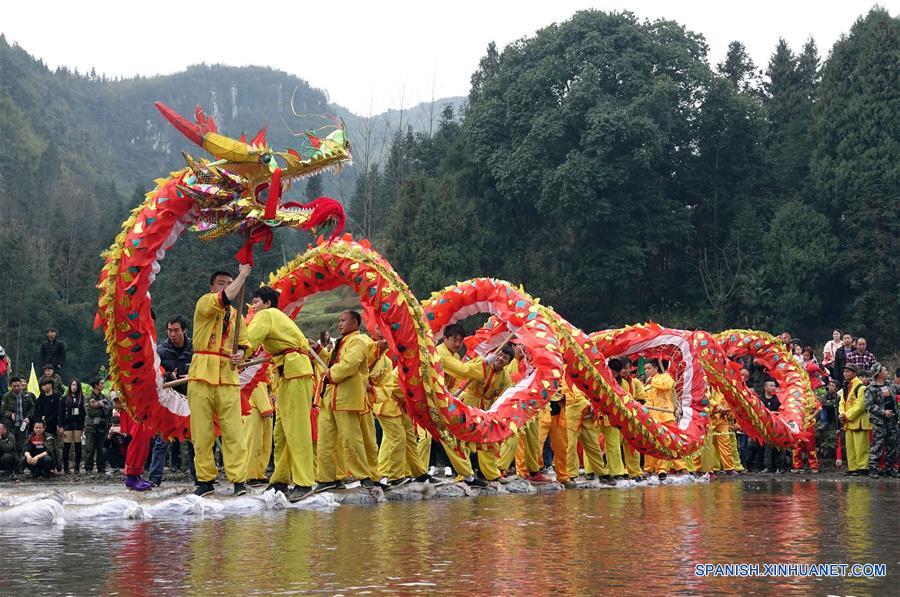 GUIZHOU, febrero 28, 2018 (Xinhua) -- Residentes interpretan la danza del dragón, en la antigua localidad de Zhaiying del Condado Autónomo Miao de Songtao, en Tongren, provincia de Guizhou, en el suroeste de China, el 28 de febrero de 2018. Un festival cultural de arte de la danza del dragón fue llevado a cabo el miércoles en el lugar. (Xinhua/Qin Gang)