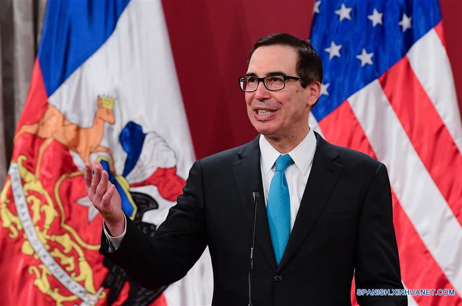 SANTIAGO, marzo 21, 2018 (Xinhua) -- El secretario del Tesoro de Estados Unidos, Steven Mnuchin, participa durante una conferencia de la prensa conjunta después de una reunión con el presidente de Chile, Sebastián Pi?era, llevada a cabo en el Palacio de La Moneda, en Santiago, capital de Chile, el 21 de marzo de 2018. (Xinhua/Jorge Villegas)