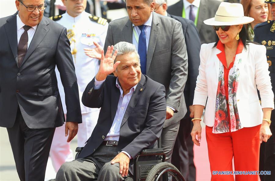 LIMA, abril 12, 2018 (Xinhua) -- El presidente de Ecuador, Lenín Moreno (c-frente), acompa?ado por su esposa Rocío González (d), llega para participar en la VIII Cumbre de las Américas, en Lima, Perú, el 12 de abril de 2018. El presidente de Ecuador, Lenín Moreno, viajó el jueves a Perú para participar en la VIII Cumbre de las Américas que se efectuará el viernes y el sábado en Lima, la capital del país, y mantener reuniones bilaterales. La Secretaría Nacional de Comunicación (Secom) informó en un comunicado que el mandatario partió a las 11:00 hora local (16:00 GMT) desde el aeropuerto Mariscal Sucre de Quito. (Xinhua/Luis Iparraguirre/ANDINA)