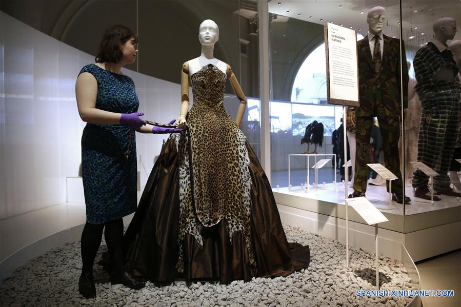 Una trabajadora permanece frente a un vestido de noche en la exhibición "Fashioned from Nature", en el Museo de Victoria y Alberto, en Londres, Reino Unido, el 18 de abril de 2018. De acuerdo con información de la prensa local, la exhibición será abierta al público el 21 de abril, y explora la relación entre la moda y la naturaleza. (Xinhua/Tim Ireland)