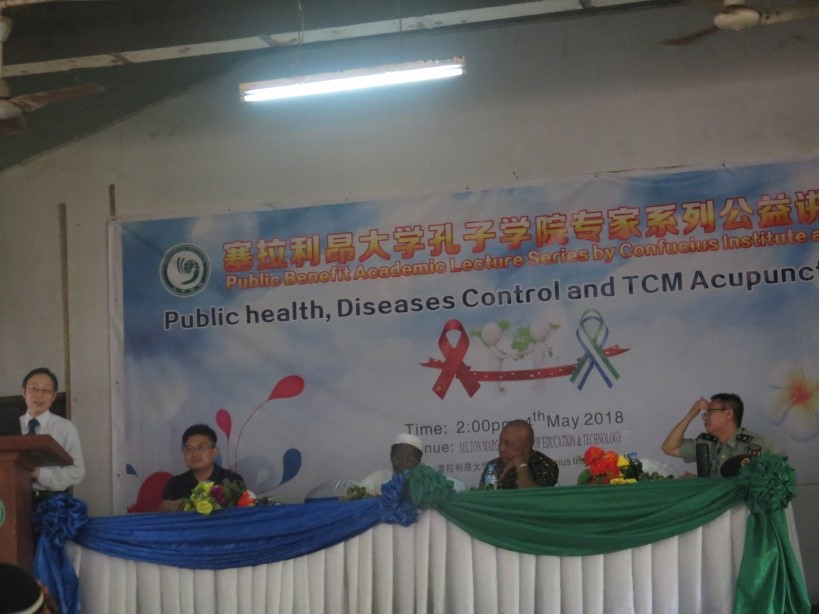 Freetown, Sierra Leona, 09/05/2018 (El Pueblo en Línea) - El Instituto Confucio de la Universidad de Sierra Leona está organizando una serie de conferencias médicas a cargo de tres expertos médicos chinos. Una de esas conferencias se llevó a cabo en el Colegio Milton Margai de Educación y Tecnología (MMCET) el viernes 4 de mayo de 2018 en Freetown. Los tres expertos son el Dr. Xiao Ning, del Centro de China para el Control de Enfermedades con su tema "Salud global y enfermedades tropicales: impactos en la salud humana"; el Dr. Huang Lei del equipo médico militar chino con su tema "Hacia una cura contra el VIH"; y el Dr. Xie Weibin del equipo médico chino dela unidad 19 con su tema "Una ventana hacia la medicina tradicional china".