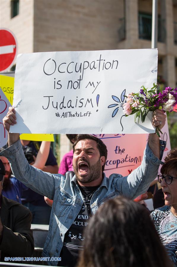 JERUSALEN, mayo 14, 2018 (Xinhua) -- Una persona participa en una protesta contra la nueva embajada estadounidense en Jerusalén, el 14 de mayo de 2018. De acuerdo con información de la prensa local, la ceremonia de inauguración de la nueva embajada estadounidense en Jerusalén comenzó el lunes por la tarde, y los israelíes y funcionarios estadounidenses se reunieron en la ciudad mientras ocurrían fuertes enfrentamientos en la Franja de Gaza. (Xinhua/Guo Yu)