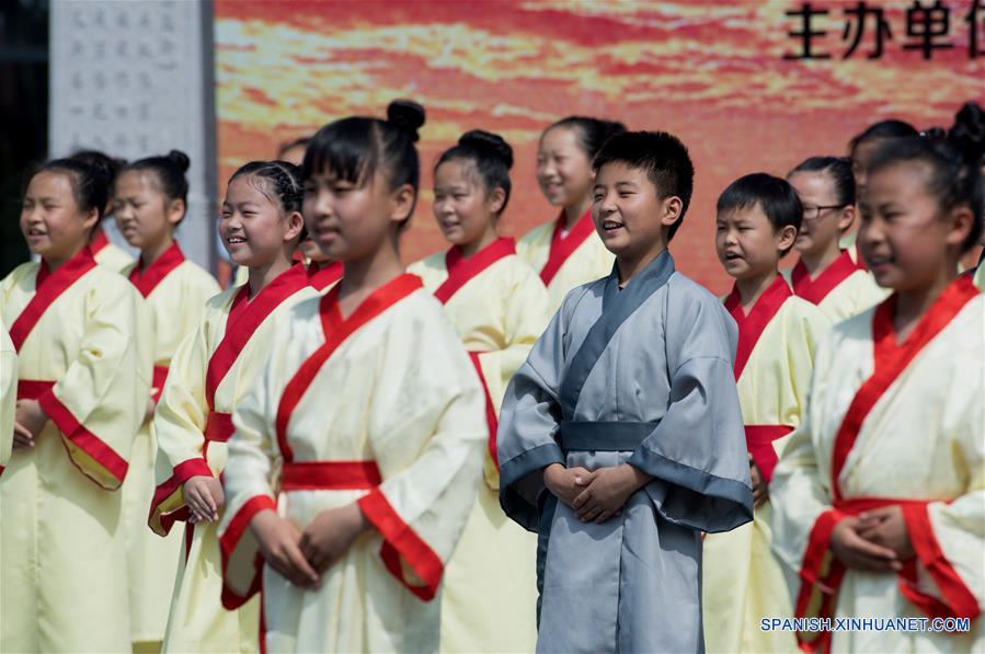 Estudiantes corean poemas durante la ceremonia de inauguración de la temporada de lectura, en el condado de Tiantai, provincia de Zhejiang, en el este de China, el 15 de mayo de 2018. (Xinhua/Weng Xinyang)