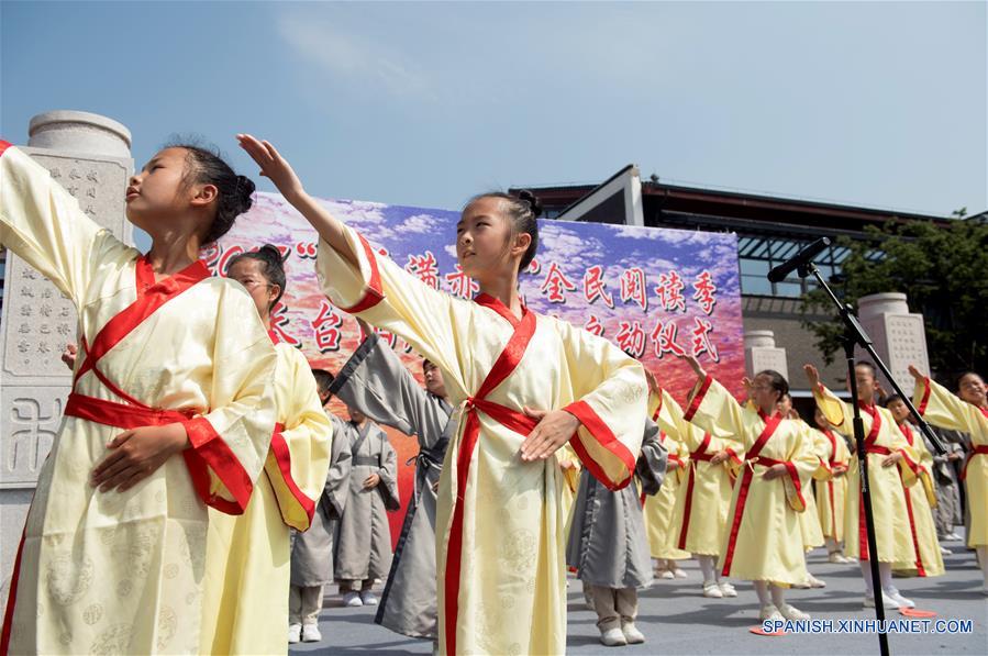 ZHEJIANG, mayo 15, 2018 (Xinhua) -- Estudiantes corean poemas durante la ceremonia de inauguración de la temporada de lectura, en el condado de Tiantai, provincia de Zhejiang, en el este de China, el 15 de mayo de 2018. (Xinhua/Weng Xinyang)