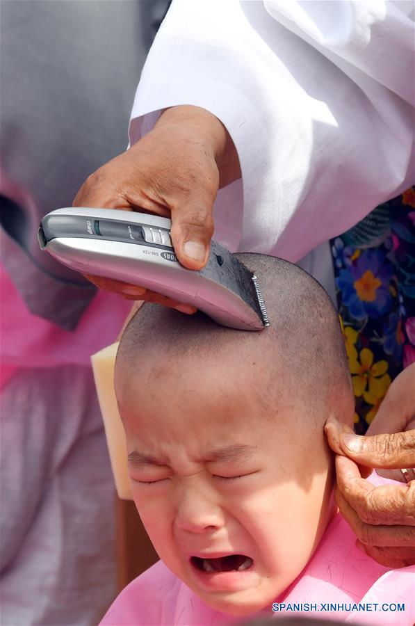 Un ni?o monje reacciona mientras es afeitado de la cabeza durante una ceremonia llevada a cabo por el próximo aniversario del cumplea?os de Buda, en Pusan, República de Corea, el 15 de mayo de 2018. (Xinhua/Newsis)