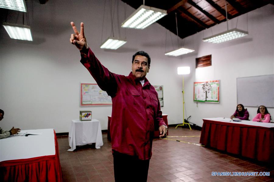 El presidente venezolano y candidato a la reelección por el partido Frente Amplio de la Patria, Nicolás Maduro, posa luego de emitir su voto en un centro de votación en el colegio Miguel Antonio Caro, en Catia, Caracas, Venezuela, el 20 de mayo de 2018. El presidente venezolano y candidato a la relección, Nicolás Maduro, ejerció su derecho al voto a primera hora en las elecciones presidenciales y de consejos legislativos que se llevan a cabo el domingo en el país suramericano. "He sido el primer votante de la patria", dijo Maduro en una rueda de prensa tras depositar su voto en el colegio Miguel Antonio Caro, ubicado en Catia, parte de una populosa parroquia al oeste de Caracas. El jefe de Estado rechazó "la campa?a feroz" contra las elecciones venezolanas realizada por algunos países y medios occidentales. (Xinhua/Boris Vergara)