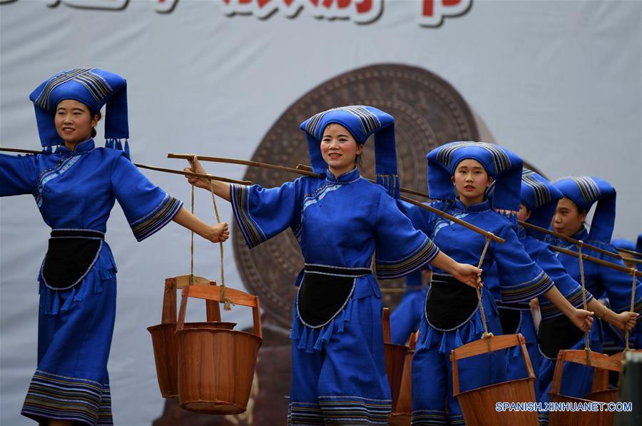 Mujeres interpretan una danza drama durante una celebración del Festival Weifeng, en el municipio de Luwei del condado de Binyang, en la Región Autónoma Zhuang de Guangxi, en el sur de China, el 22 de mayo de 2018. Las personas del grupo étnico Zhuang celebran el festival en el octavo día del cuarto mes en el calendario lunar chino. (Xinhua/Lu Bo'an)
