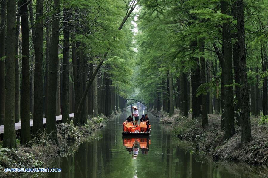 JIANGSU, junio 5, 2018 (Xinhua) -- Turistas visitan un parque forestal acuático, en el municipio de Lizhong de Xinghua, provincia de Jiangsu, en el este de China, el 5 de junio de 2018. (Xinhua/Meng Delong)