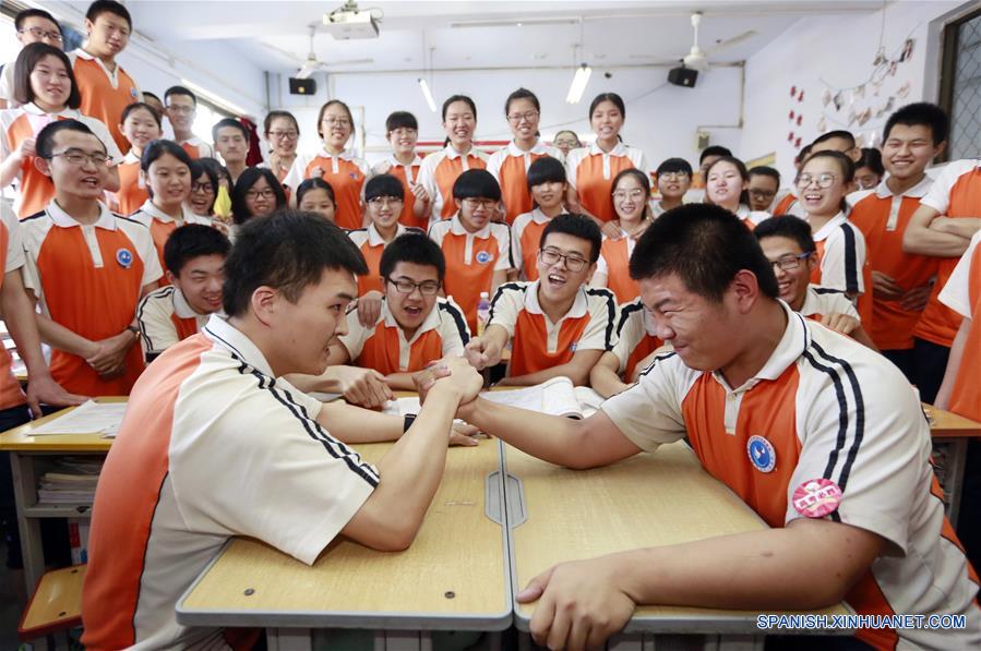 Estudiantes participan en juegos en la Escuela Secundaria No.14, en la ciudad de Hengshui, provincia de Hebei, en el norte de China, el 5 de junio de 2018. Varias actividades fueron llevadas a cabo para ayudar a los estudiantes a relajarse y estar mejor preparados para el próximo exámen nacional de entrada a la universidad. (Xinhua/Zhu Xudong)