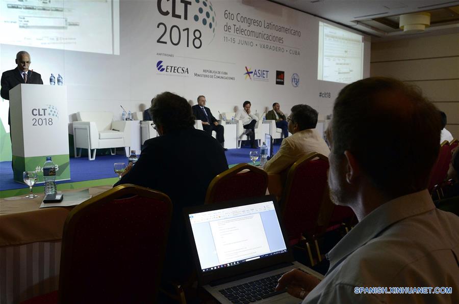 El ministro de Comunicaciones de Cuba, Maimir Mesa Ramos (i), pronuncia un discurso durante el Sexto Congreso Latinoamericano de Telecomunicaciones, llevado a cabo en el Hotel Meliá Marina Varadero, en Varadero, Cuba, el 12 de junio de 2018. (Xinhua/Joaquín Hernández)