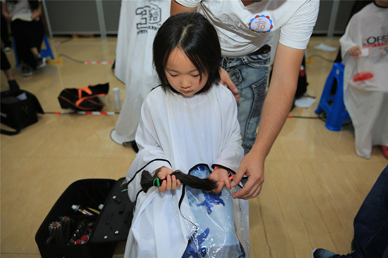 Co-organizado por el Hospital del Ni?o de Shanghai, los 100 voluntarios -muchos de los cuales son jóvenes estudiantes- se reunieron en la escuela secundaria No.4, afiliada a la Universidad Normal de China Oriental, donde la Asociación de Peluquería y Belleza enviaron a varios peluqueros para colectar los cabellos.