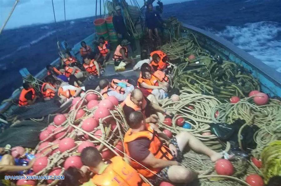 PHUKET, julio 5, 2018 (Xinhua) -- Turistas rescatados permanecen a bordo de un bote cerca de la isla de Phuket, Tailandia, el 5 de julio de 2018. Rescatistas encontraron el cuerpo de un turista y están buscando a otras 53 personas aún desaparecidas luego de que tres barcos naufragaron en un mar embravecido en la provincia tailandesa de Phuket, dijo el jueves por la noche el gobernador de la provincia, Norraphat Plodthong. De acuerdo con el medio tailandés Thai PBS, el gobernador dijo que un total de 93 personas, entre ellas 12 miembros de la tripulación y guías, se encontraban a bordo del barco Phoenix que naufragó cerca de la isla de Koh He en la provincia de Phuket. Otro barco llamado Jet Ski, con dos pasajeros rusos a bordo, y una tercera embarcación con 41 pasajeros, dos tripulantes y 39 turistas, también naufragaron, pero todos fueron rescatados. (Xinhua/Str)