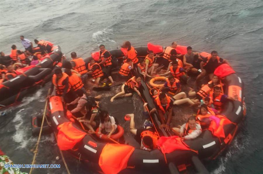 PHUKET, julio 5, 2018 (Xinhua) -- Turistas rescatados permanecen a bordo de botes salvavidas cerca de la isla de Phuket, Tailandia, el 5 de julio de 2018. Rescatistas encontraron el cuerpo de un turista y están buscando a otras 53 personas aún desaparecidas luego de que tres barcos naufragaron en un mar embravecido en la provincia tailandesa de Phuket, dijo el jueves por la noche el gobernador de la provincia, Norraphat Plodthong. De acuerdo con el medio tailandés Thai PBS, el gobernador dijo que un total de 93 personas, entre ellas 12 miembros de la tripulación y guías, se encontraban a bordo del barco Phoenix que naufragó cerca de la isla de Koh He en la provincia de Phuket. Otro barco llamado Jet Ski, con dos pasajeros rusos a bordo, y una tercera embarcación con 41 pasajeros, dos tripulantes y 39 turistas, también naufragaron, pero todos fueron rescatados. (Xinhua/Str)
