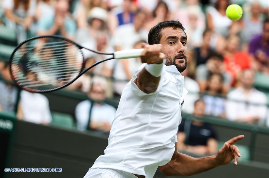 LONDRES, julio 4, 2018 (Xinhua) -- Marin Cilic, de Croacia, devuelve la pelota a Guido Pella, de Argentina, durante el partido individual varonil de segunda ronda del Campeonato de Wimbledon 2018, en Londres, Reino Unido, el 4 de julio de 2018. (Xinhua/Tang Shi)