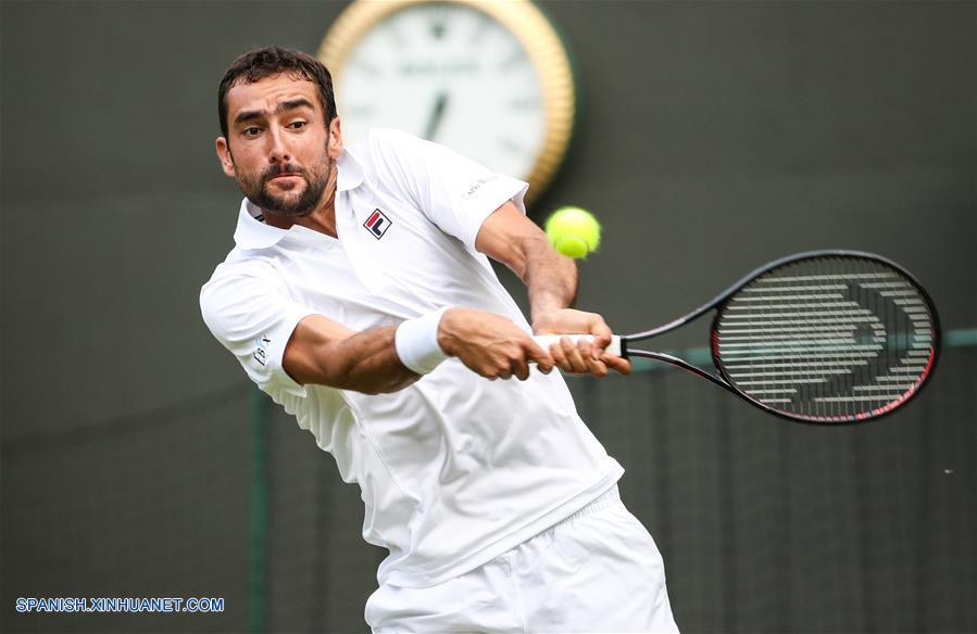 LONDRES, julio 4, 2018 (Xinhua) -- Marin Cilic, de Croacia, devuelve la pelota a Guido Pella, de Argentina, durante el partido individual varonil de segunda ronda del Campeonato de Wimbledon 2018, en Londres, Reino Unido, el 4 de julio de 2018. (Xinhua/Tang Shi)