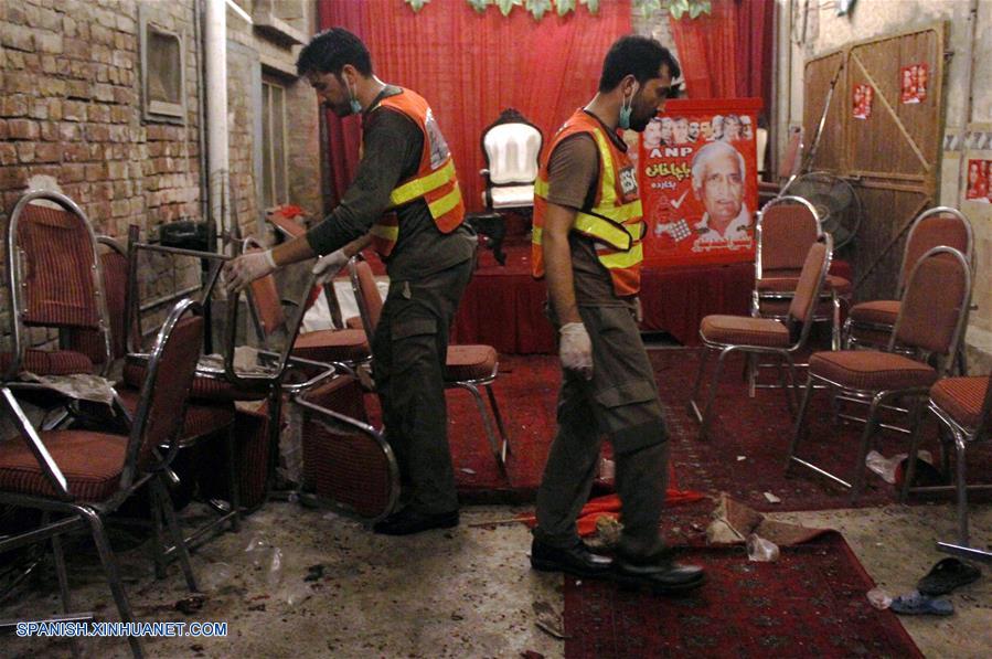 Rescatistas laboran en el sitio de una explosión en Peshawar, en el noroeste de Pakistán, el 10 de julio de 2018.(Xinhua/Saeed Ahmad)