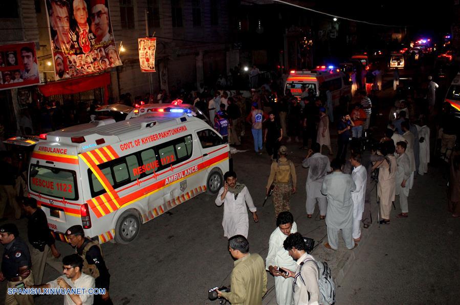 Personas caminan frente a una ambulancia cerca del sitio de una explosión en Peshawar, en el noroeste de Pakistán, el 10 de julio de 2018. (Xinhua/Saeed Ahmad)