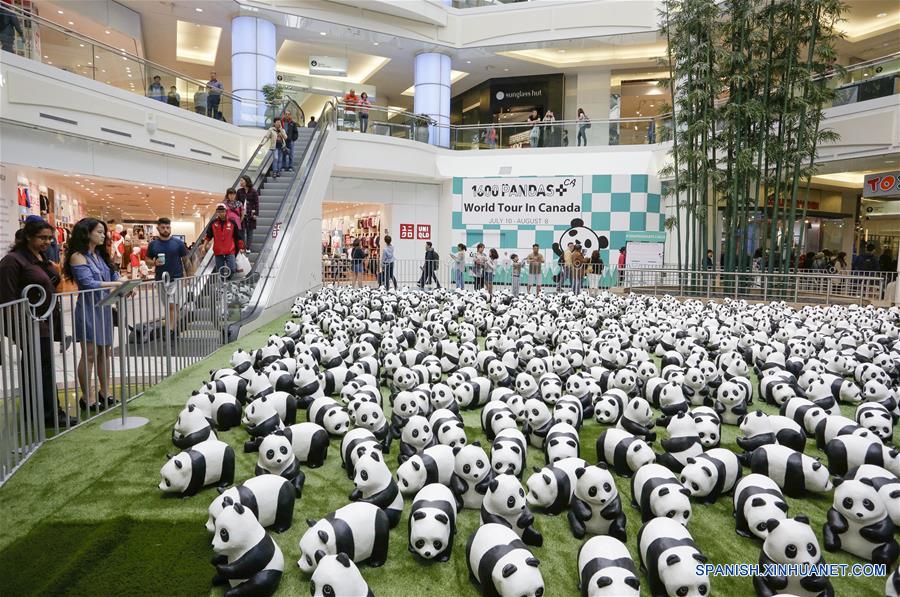 Imagen del 10 de julio de 2018 de pandas de papel maché siendo exhibidos durante la exposición de obras de papel maché "1,600 Pandas" implementada en el centro comercial Metrotown, en Vancouver, Canadá. "1,600 Pandas", una obra de papel maché creada en 2008 por el artista francés, Paulo Grangeon, para el Fondo Mundial para la Naturaleza (WWF, por sus siglas en inglés), comenzó el martes su gira de exposición en Canadá. (Xinhua/Liang sen)
