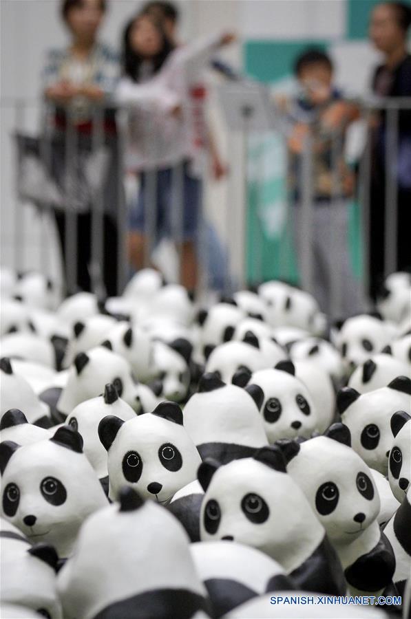 VANCOUVER, julio 11, 2018 (Xinhua) -- Imagen del 10 de julio de 2018 de pandas de papel maché siendo exhibidos durante la exposición de obras de papel maché "1,600 Pandas" implementada en el centro comercial Metrotown, en Vancouver, Canadá. "1,600 Pandas", una obra de papel maché creada en 2008 por el artista francés, Paulo Grangeon, para el Fondo Mundial para la Naturaleza (WWF, por sus siglas en inglés), comenzó el martes su gira de exposición en Canadá. (Xinhua/Liang sen)