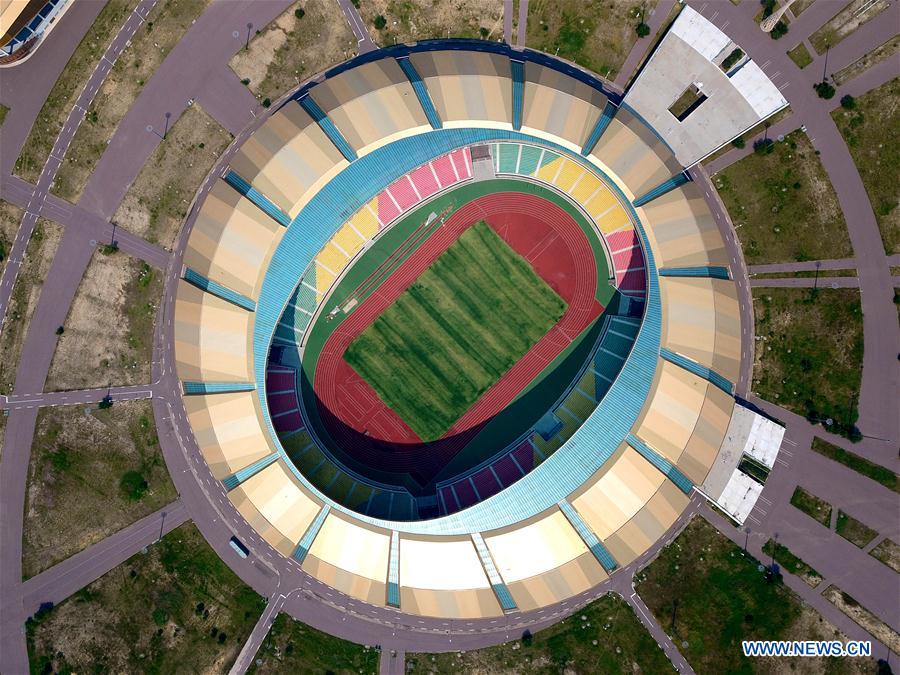 Foto aérea del 10 de junio de 2018 muestra el centro deportivo construido con asistencia china en Brazzaville, capital de la República del Congo. En los últimos cinco a?os, China y las naciones africanas han profundizado la confianza política mutua, la asistencia mutua en el desarrollo y el aprendizaje mutuo en visiones, y han realizado esfuerzos concertados para construir “Un Cinturón – Una Ruta” y una comunidad China-áfrica más cercana con un futuro compartido. [Foto / Xinhua]
