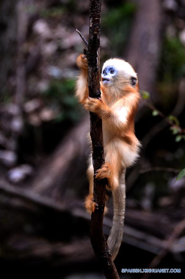 Imagen del 3 de agosto de 2018 de un mono dorado jugando en el valle del panda gigante de la Monta?a Qinling en el condado de Foping, provincia de Shaanxi, en el noroeste de China. Los monos dorados de Qinling están bajo protección de primer nivel de China. Su número se ha elevado de 3,000 en 1998 a 5,000 en el presente gracias a la mejora del medio ambiente y el trabajo de protección. (Xinhua/Liu Xiao)