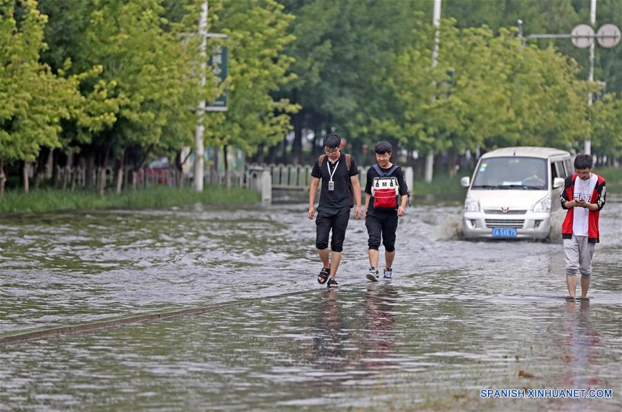 Peatones y un vehículo vadean a través de una calle inundada, en Shenyang, capital de la provincia de Liaoning, en el noreste de China, el 7 de agosto de 2018. Una lluvia torrencial causó el martes la inundación en Shenyang. (Xinhua/Yang Qing)