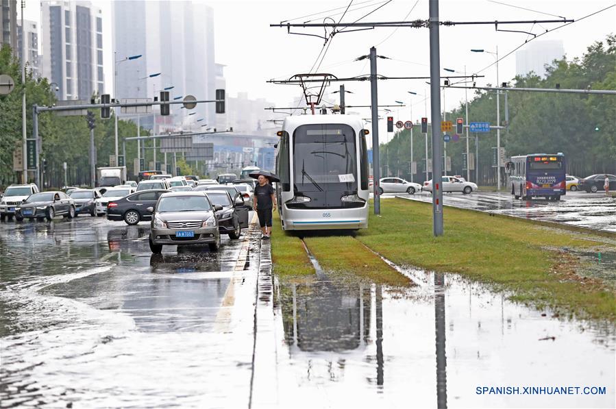 Vehículos esperan para avanzar a través de una calle inundada, en Shenyang, capital de la provincia de Liaoning, en el noreste de China, el 7 de agosto de 2018. Una lluvia torrencial causó el martes la inundación en Shenyang. (Xinhua/Yang Qing)
