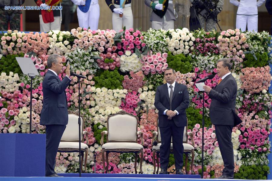 Imagen cedida por la Presidencia de Colombia, de Iván Duque (i), participando en su ceremonia de juramentación como presidente colombiano, en la Plaza Bolívar, en Bogotá, Colombia, el 7 de agosto de 2018. El presidente colombiano, Iván Duque, tomó el martes juramento como el mandatario número 60 del país andino, y se convirtió en el cuarto jefe de Estado más joven en tomar posesión de ese cargo, que asumirá por un periodo de cuatro a?os y reemplazará al saliente Juan Manuel Santos. (Xinhua/David Romo/Presidencia de Colombia)