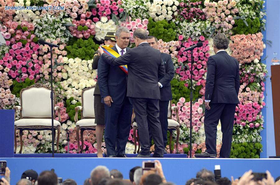 Imagen cedida por la Presidencia de Colombia, del presidente colombiano, Iván Duque (i-frente), participando durante su ceremonia de juramentación, en la Plaza Bolívar, en Bogotá, Colombia, el 7 de agosto de 2018. El presidente colombiano, Iván Duque, tomó el martes juramento como el mandatario número 60 del país andino, y se convirtió en el cuarto jefe de Estado más joven en tomar posesión de ese cargo, que asumirá por un periodo de cuatro a?os y reemplazará al saliente Juan Manuel Santos. (Xinhua/David Romo/Presidencia de Colombia)