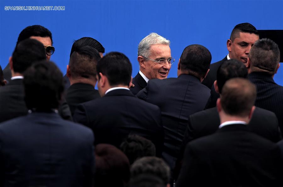 El expresidente de Colombia y senador, Alvaro Uribe (c), asiste a la ceremonia de juramentación del presidente electo colombiano, Iván Duque, en la Plaza Bolívar, en Bogotá, capital de Colombia, el 7 de agosto de 2018. El presidente colombiano, Iván Duque, tomó el martes juramento como el mandatario número 60 del país andino, y se convirtió en el cuarto jefe de Estado más joven en tomar posesión de ese cargo, que asumirá por un periodo de cuatro a?os y reemplazará al saliente Juan Manuel Santos. (Xinhua/Diego Pineda/COLPRENSA)