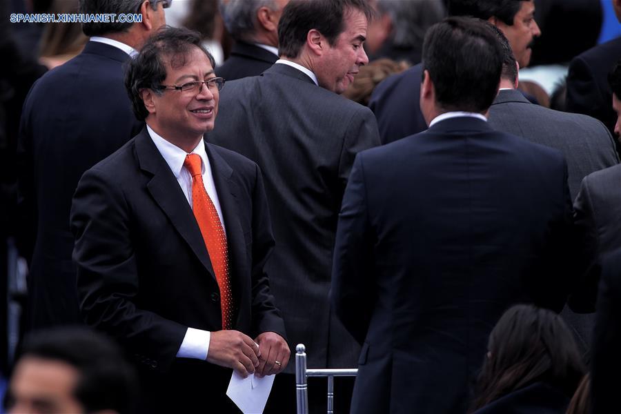 El excandidato presidencial colombiano por el movimiento político Colombia Humana, Gustavo Petro (i-frente), asiste a la ceremonia de juramentación del presidente electo de Colombia, Iván Duque, en la Plaza Bolívar, en Bogotá, capital de Colombia, el 7 de agosto de 2018. El presidente colombiano, Iván Duque, tomó el martes juramento como el mandatario número 60 del país andino, y se convirtió en el cuarto jefe de Estado más joven en tomar posesión de ese cargo, que asumirá por un periodo de cuatro a?os y reemplazará al saliente Juan Manuel Santos. (Xinhua/Diego Pineda/COLPRENSA)
