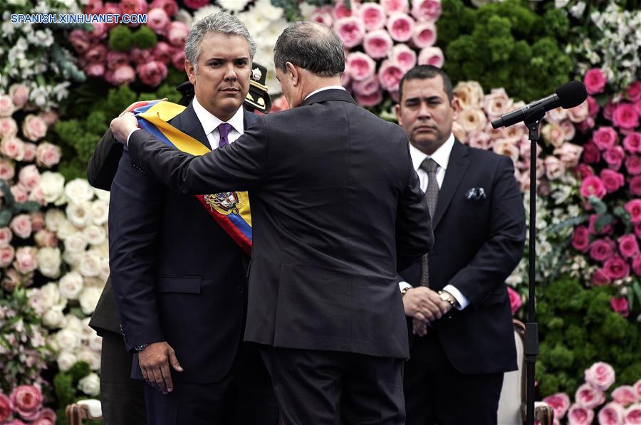 El presidente de Colombia, Iván Duque (i), participa en su ceremonia de juramentación, en la Plaza Bolívar, en Bogotá, Colombia, el 7 de agosto de 2018. El presidente colombiano, Iván Duque, tomó el martes juramento como el mandatario número 60 del país andino, y se convirtió en el cuarto jefe de Estado más joven en tomar posesión de ese cargo, que asumirá por un periodo de cuatro a?os y reemplazará al saliente Juan Manuel Santos. (Xinhua/Jhon Paz)