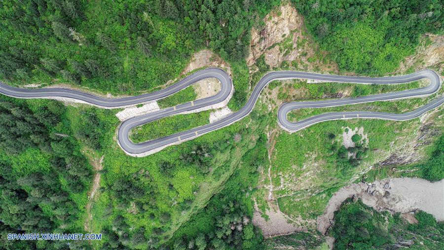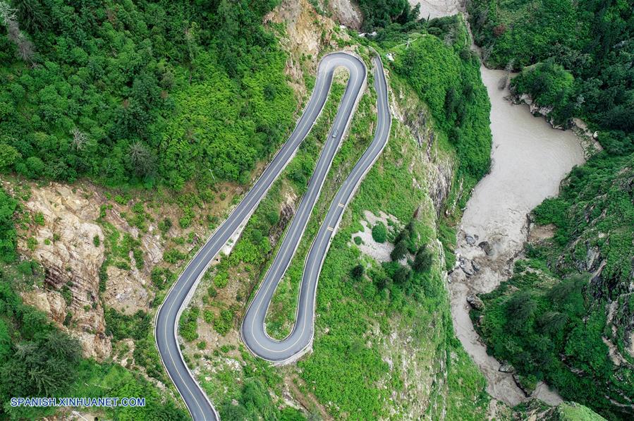 GYIRONG, agosto 13, 2018 (Xinhua) -- Imagen del 12 de agosto de 2018 de la vista aérea de un camino sinuoso en la monta?a de la autopista Gyirong Pass, en el condado Gyirong de la ciudad de Xigaze, Región Autónoma del Tíbet, en el suroeste de China. La autopista Gyirong Pass, una sección de 94 kilómetros de la Autopista Nacional 216, es una importante ruta de comercio que conecta a China y a Nepal. La carretera fue afectada gravemente por el devastador terremoto ocurrido en Nepal en abril de 2015. Ahora la carretera ha retomado vitalidad y tiene un nuevo aspecto después de a?os de reparación y reconstrucción, mientras el volumen anual del comercio del Puerto de Gyirong creció casi siete veces desde el periodo post-terremoto a alcanzar los 2.8 billones de yuanes (414 millones de dólares estadounidenses) en 2017. (Xinhua/Liu Dongjun)