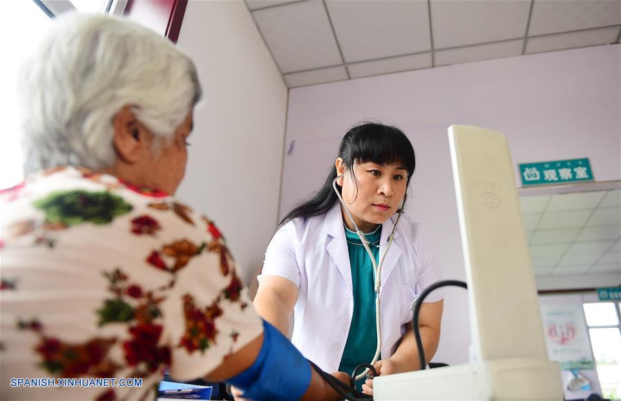 JILIN, agosto 17, 2018 (Xinhua) -- Imagen del 9 de agosto de 2018 de Yue Yanwei (d) midiendo la presión sanguínea de una paciente, en la villa de Qixin en la localidad de Gangyao de la ciudad de Jilin, provincia de Jilin, en el noreste de China. Yue, de 40 a?os de edad, ha sido doctora en la villa de Qixin durante 17 a?os desde su graduación de la escuela de medicida en 2001. Yue es el único médico en Qixin, donde viven unos 1,070 aldeanos. En opinion de Yue, la salud de todos importa, por lo que optó por permanecer en su puesto y se hizo cargo de los aldeanos. (Xinhua/Lin Hong)