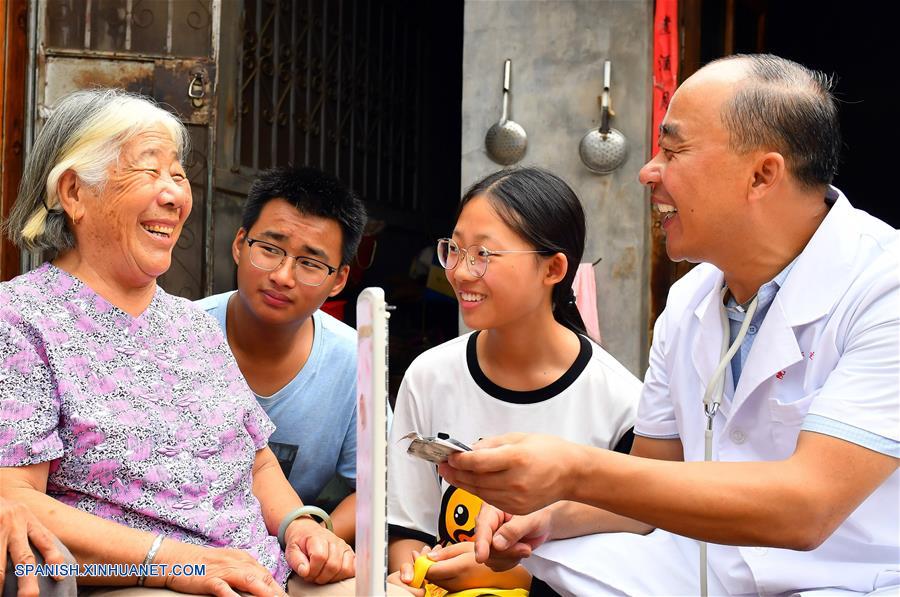 SHANDONG, agosto 17, 2018 (Xinhua) -- Imagen del 16 de agosto de 2018 de Zhang Deqing visitando a una paciente con sus dos hijos, en la villa de Liyanjian en la localidad de Yuandongtou del condado de Yishui, provincia de Shandong, en el este de China. Zhang ha sido médico de la villa de Yuandongtou de la localidad de Yuandongtou en Shandong durante 20 a?os. Su trabajo abarca a casi 2,000 aldeanos en tres villas de la localidad de Yuandongtou. Como muchos hogares están dispersos por las villas, Zhang tiene que escalar caminos monta?osos para visitar a los pacientes. Ahora hay cuatro generaciones de médicos en la familia de Zhang, incluidos el abuelo de Zhang, Zhang Daoli y el padre Zhang Zaiji. Los dos hijos de Zhang se graduaron de facultades de medicina en 2017, para convertirse en el cuarto Dr. Zhang en la ciudad. (Xinhua/Guo Xulei)