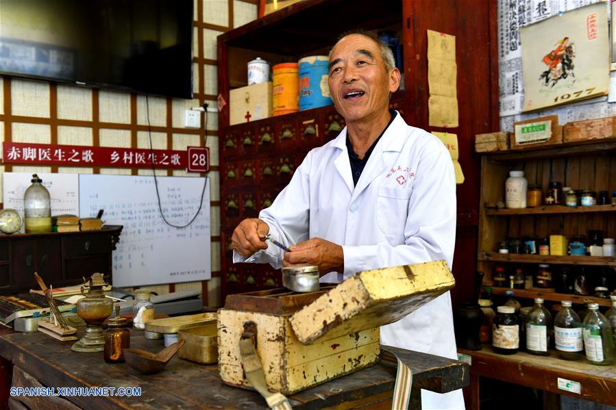 SHANDONG, agosto 17, 2018 (Xinhua) -- Imagen del 16 de agosto de 2018 del padre de Zhang Deqing, Zhang Zaiji, mostrando su botiquín, en la localidad de Yuandongtou del condado de Yishui, provincia de Shandong, en el este de China. Zhang ha sido médico de la villa de Yuandongtou de la localidad de Yuandongtou en Shandong durante 20 a?os. Su trabajo abarca a casi 2,000 aldeanos en tres villas de la localidad de Yuandongtou. Como muchos hogares están dispersos por las villas, Zhang tiene que escalar caminos monta?osos para visitar a los pacientes. Ahora hay cuatro generaciones de médicos en la familia de Zhang, incluidos el abuelo de Zhang, Zhang Daoli y el padre Zhang Zaiji. Los dos hijos de Zhang se graduaron de facultades de medicina en 2017, para convertirse en el cuarto Dr. Zhang en la ciudad. (Xinhua/Guo Xulei)